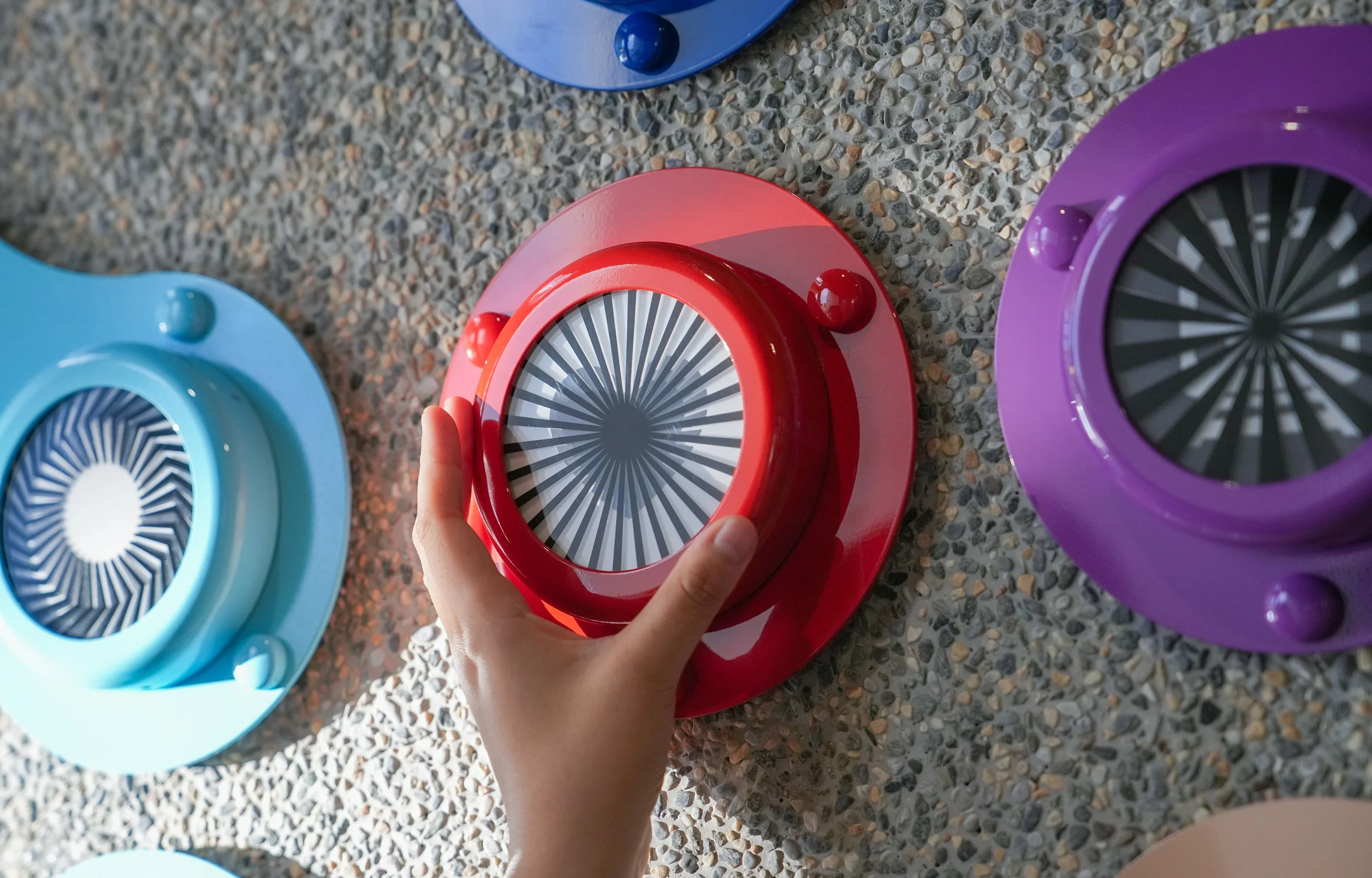 Each circle represents an iconic landmark in the region, including metro stations, the Taoyuan Station of the Taiwan High Speed Railway, parks, and an art museum. Layers of structures underneath the circles beckon viewers to interact, inviting them to touch or rotate the circles and experience the dynamic moiré patterns created in the process.